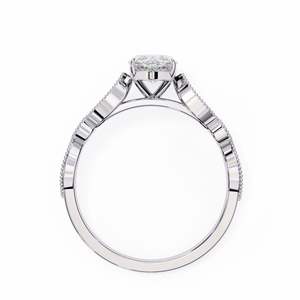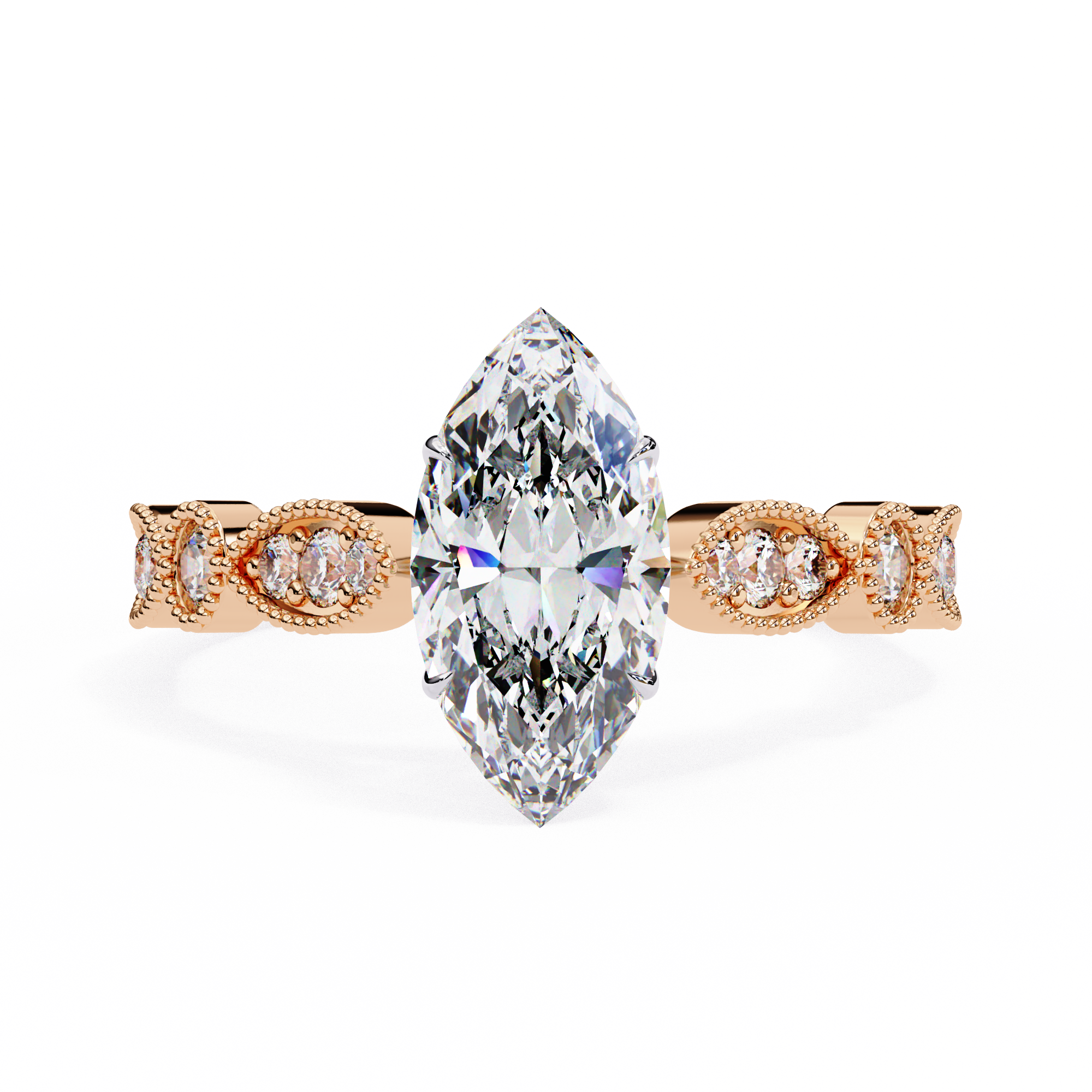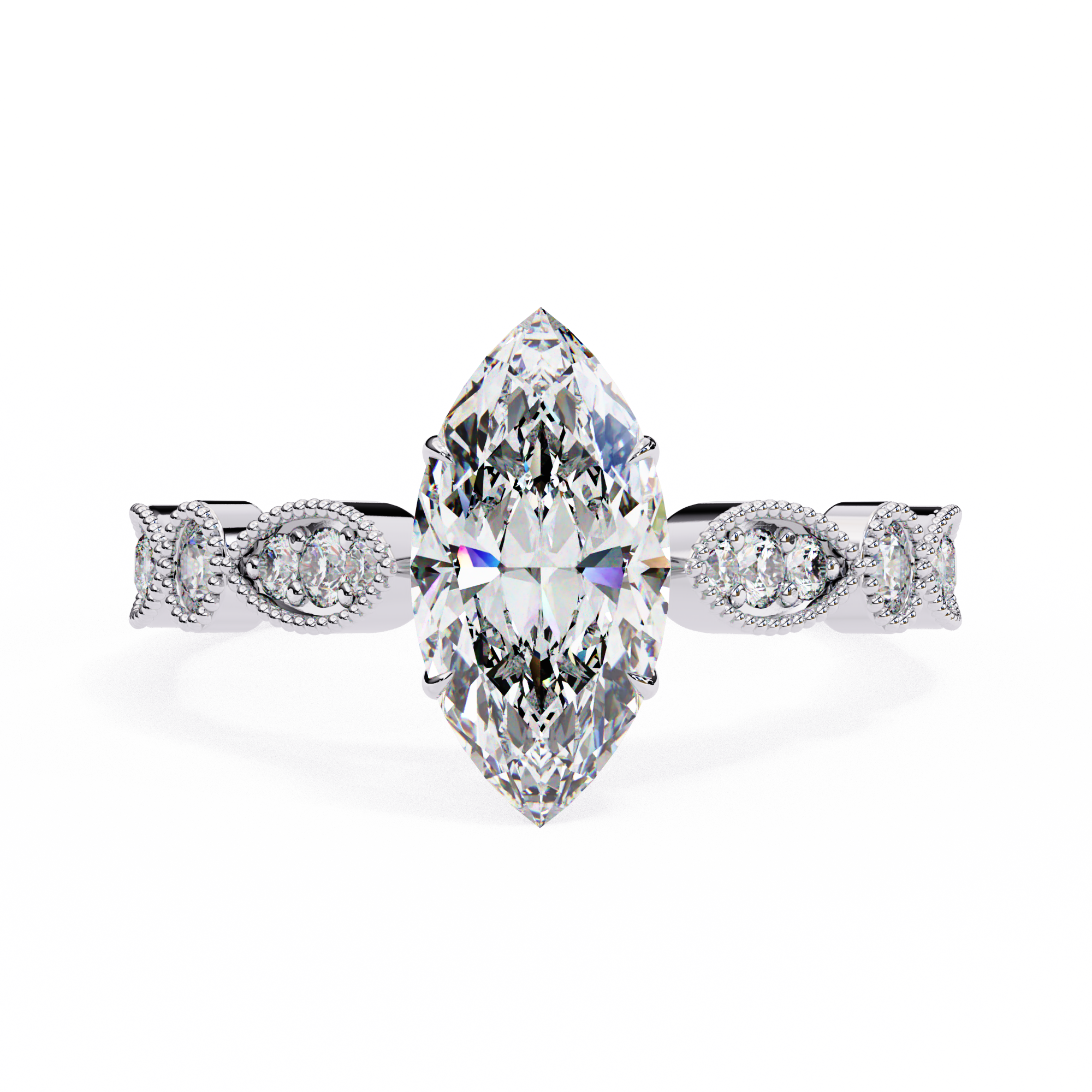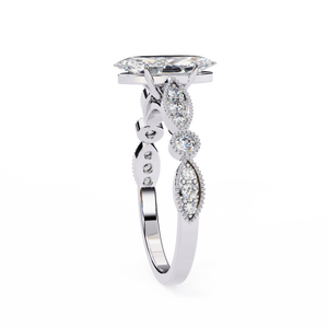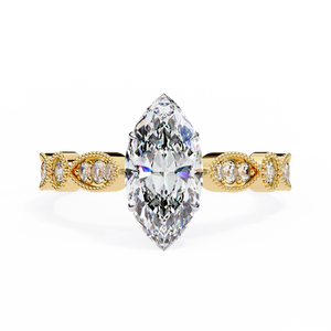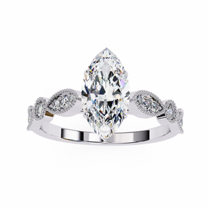 This captivating 14K white gold engagement ring showcases a dazzling marquise-cut center diamond that elongates the finger with graceful brilliance. The vintage-inspired milgrain band features alternating marquise and round diamond accents, framed with delicate beadwork for added texture and elegance. A romantic blend of timeless artistry and modern sophistication, perfect for those who adore classic yet distinctive beauty.