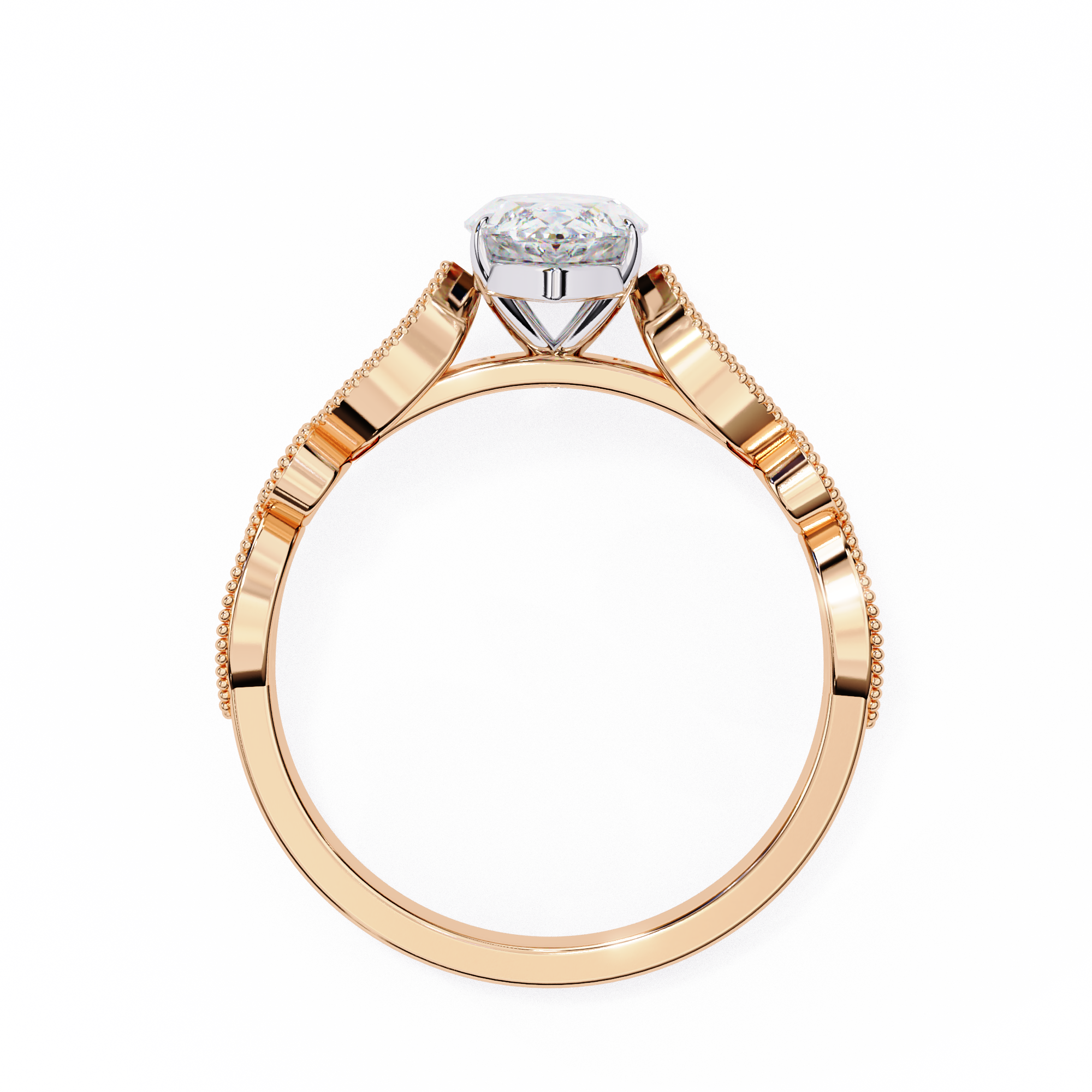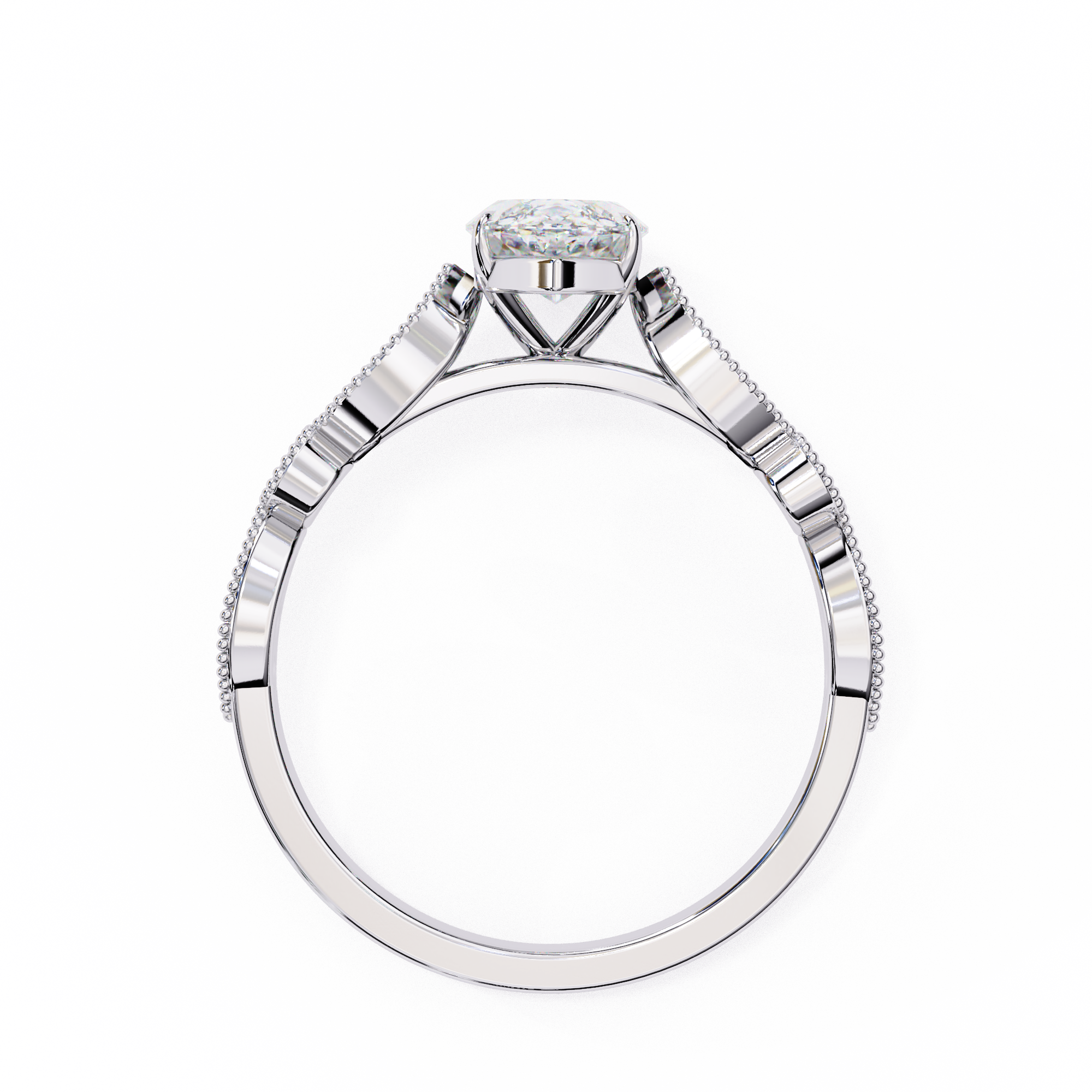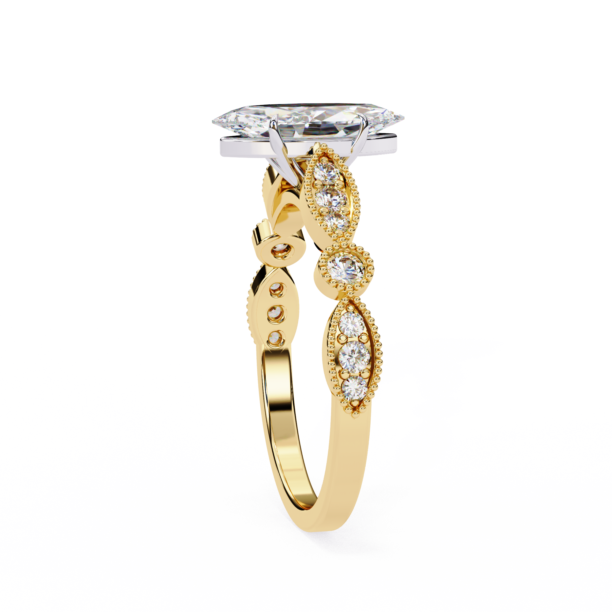 This captivating 14K white gold engagement ring showcases a dazzling marquise-cut center diamond that elongates the finger with graceful brilliance. The vintage-inspired milgrain band features alternating marquise and round diamond accents, framed with delicate beadwork for added texture and elegance. A romantic blend of timeless artistry and modern sophistication, perfect for those who adore classic yet distinctive beauty.