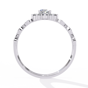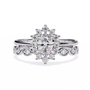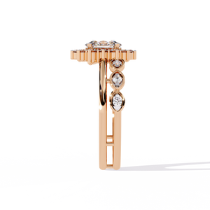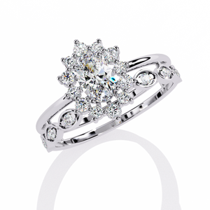 This 14K Oval Diamond Vintage Halo Engagement Ring dazzles with a radiant oval center surrounded by a starburst halo of round diamonds. The intricate band features bezel-set accents, blending timeless elegance with modern artistry. A luxurious choice for those who adore detailed, heirloom-inspired beauty.
