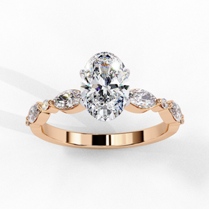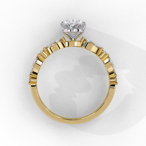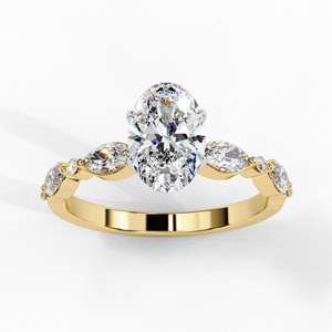 Graceful and radiant, this 14K engagement ring features an oval-cut center diamond flanked by marquise and round side stones, symbolizing eternal love and unity. The elegant design enhances the finger’s length and showcases maximum brilliance from every angle. Crafted in yellow gold with a white gold prong head, this masterpiece blends classic sophistication with modern minimalism — ideal for brides who appreciate both tradition and individuality.