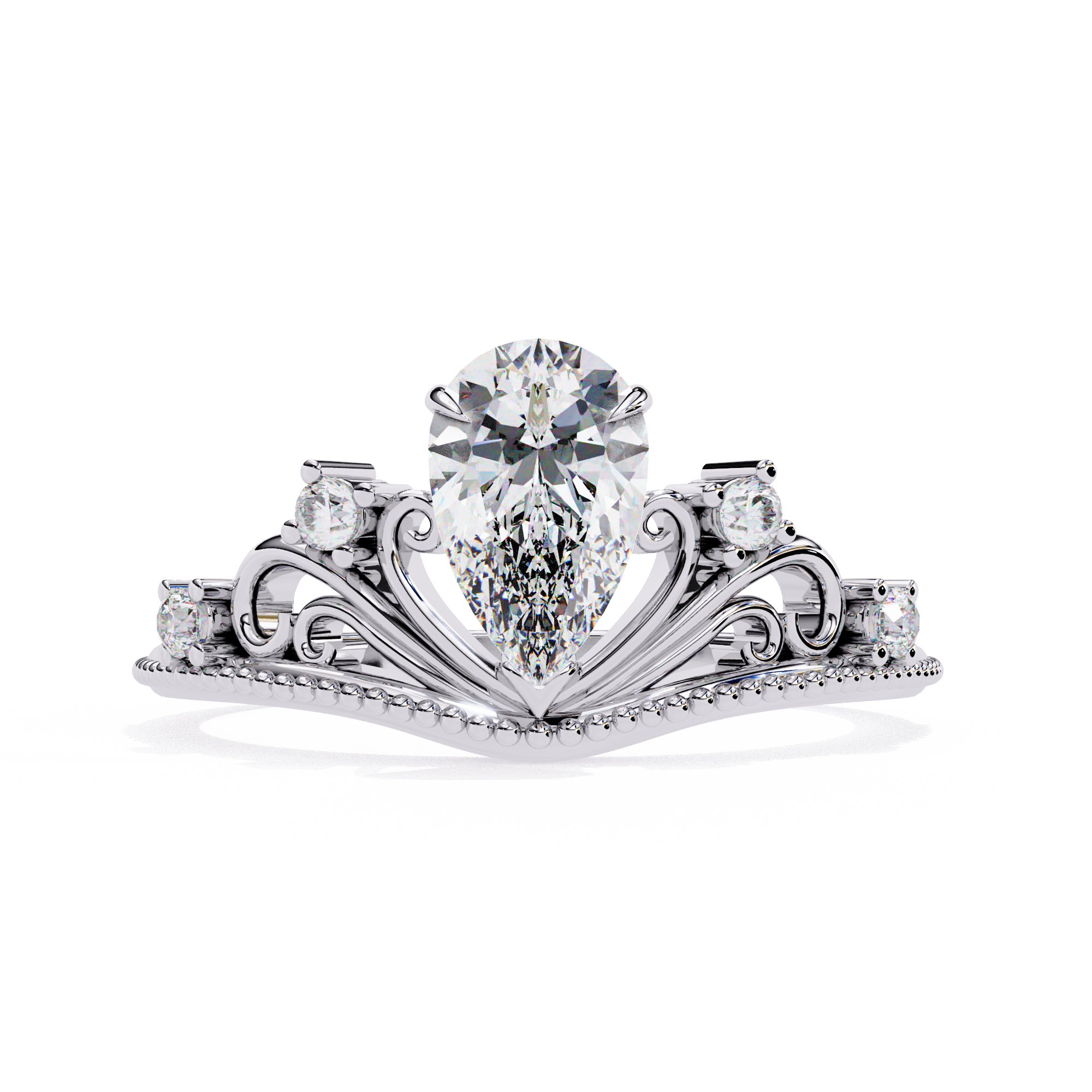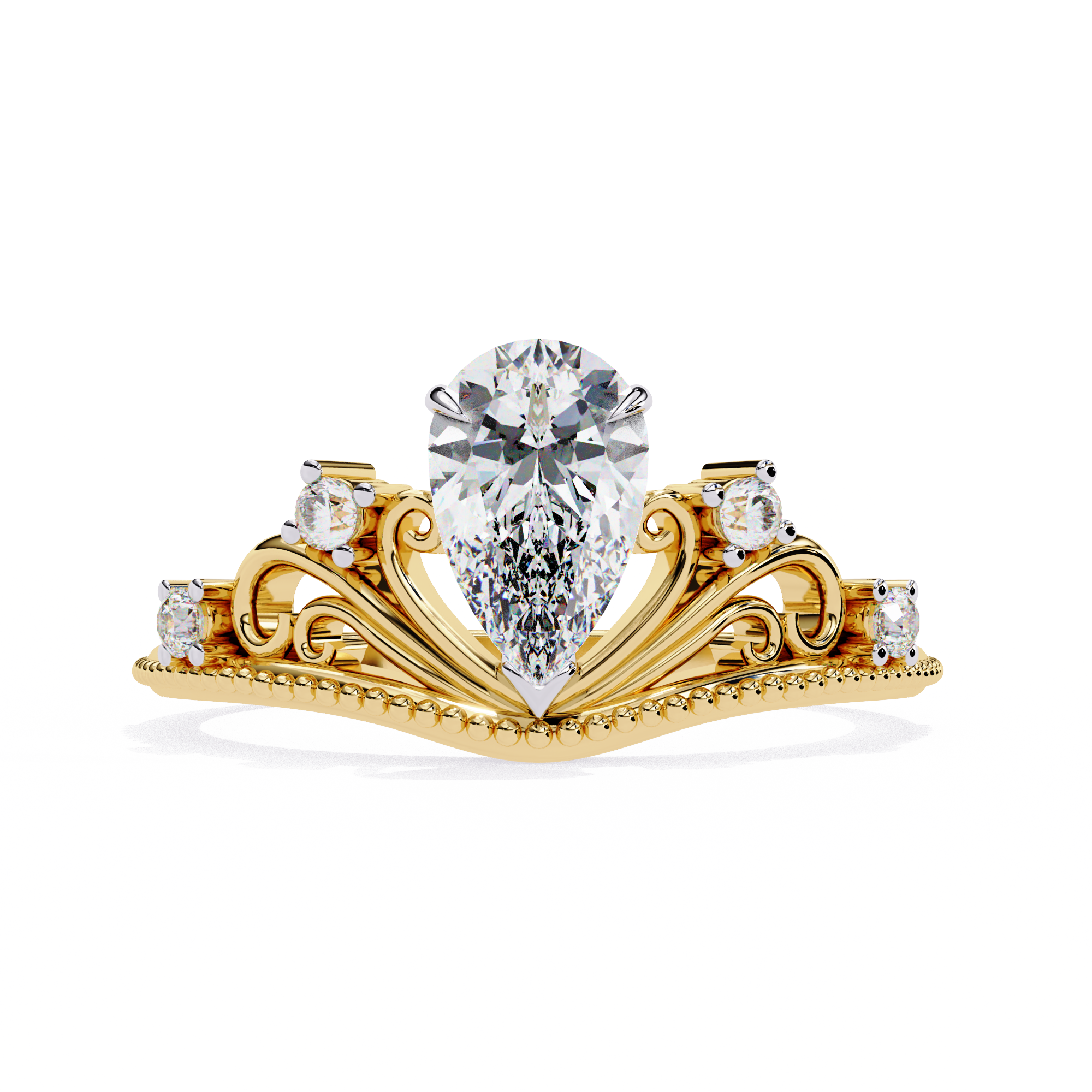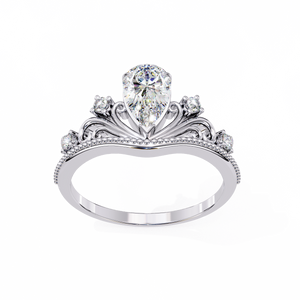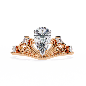 This 14K pear-cut diamond engagement ring features an exquisite vintage-inspired filigree design accented with shimmering round diamonds. The elegant scrollwork and milgrain detailing create a regal, crown-like look that exudes timeless charm. Perfect for brides who appreciate intricate craftsmanship, romantic flair, and a truly one-of-a-kind statement piece.