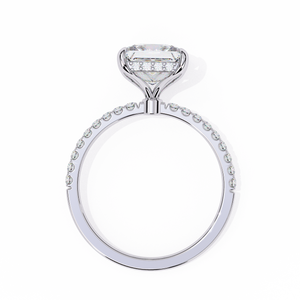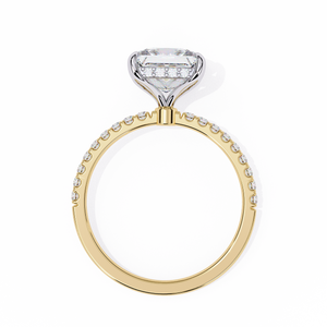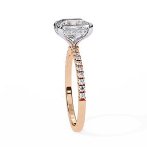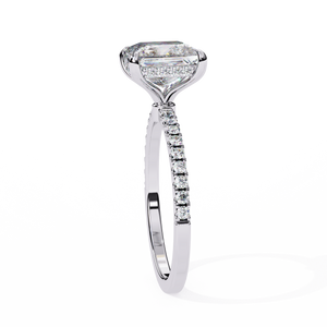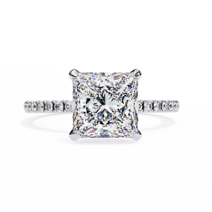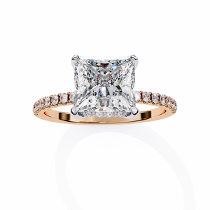 This dazzling 14K engagement ring features a stunning princess-shaped lab-grown diamond set atop a delicate diamond-accented band. The intricate detailing beneath the center stone adds brilliance from every angle, making it a perfect blend of elegance and modern luxury.