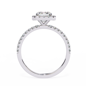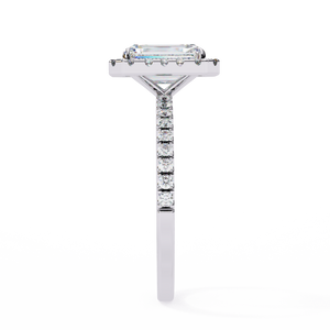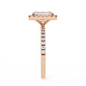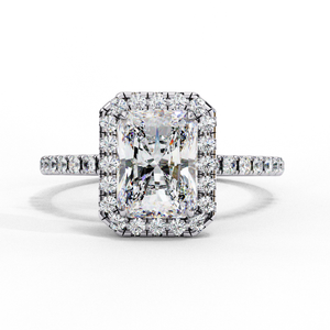 This 14K radiant halo diamond engagement ring combines brilliance with modern luxury. The radiant-cut center diamond exudes fire and sparkle, encircled by a shimmering halo of smaller diamonds. The pavé band enhances its brilliance, creating a breathtaking symbol of elegance and everlasting love.