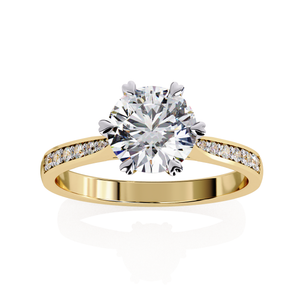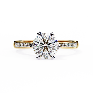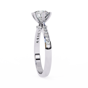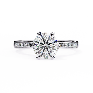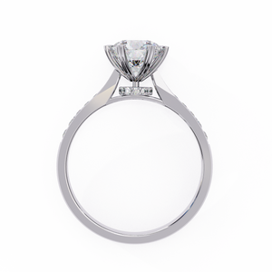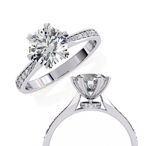 This 14K white gold engagement ring redefines timeless allure with a round brilliant-cut center diamond, gracefully elevated in a six-prong cathedral setting. The band features sparkling pavé-set diamonds that extend halfway down the shank, adding a touch of luxury and brilliance from every angle. Beneath the center stone, a hidden halo detail enhances the ring’s radiance, making it a perfect blend of modern elegance and classic romance.