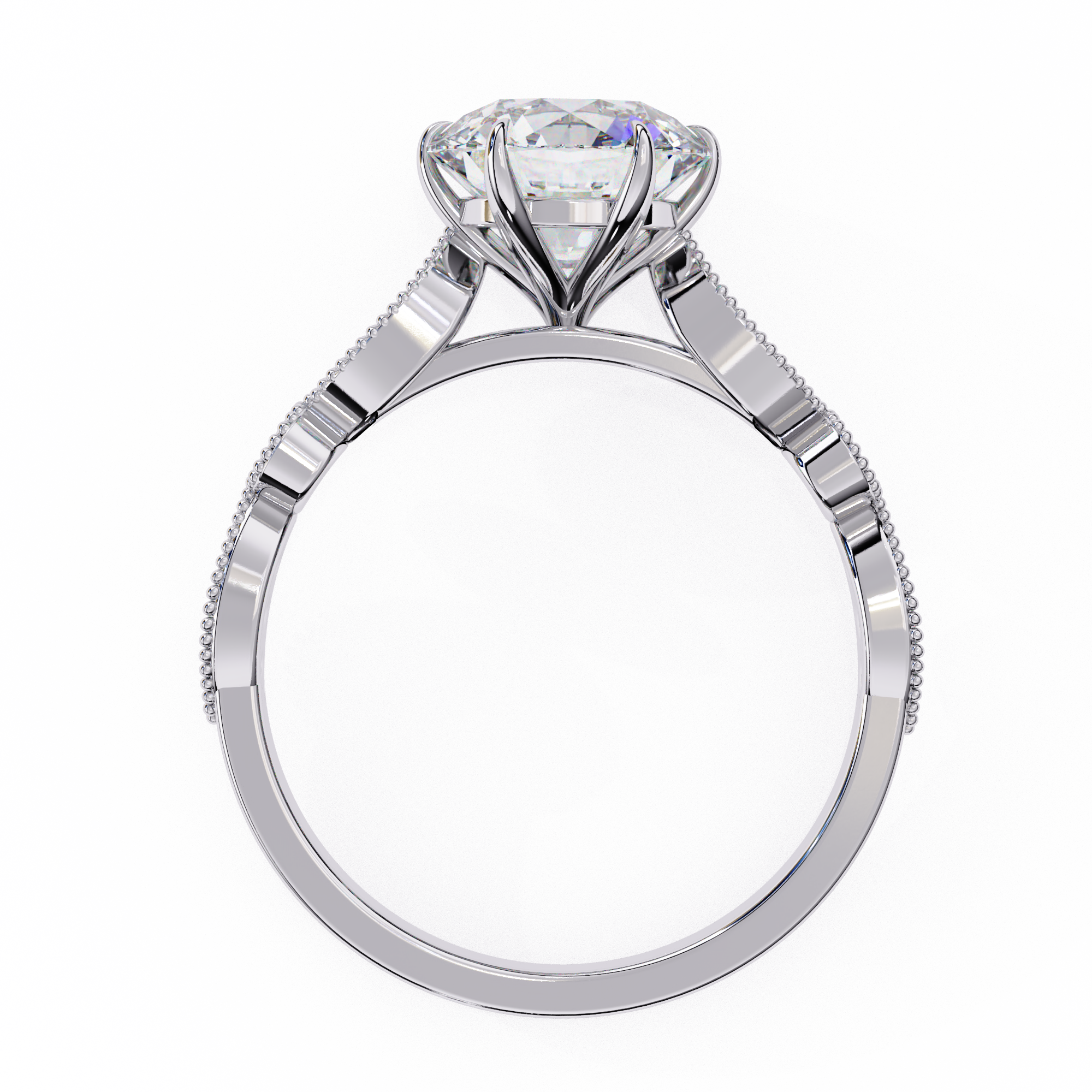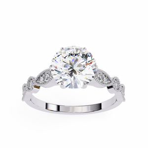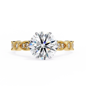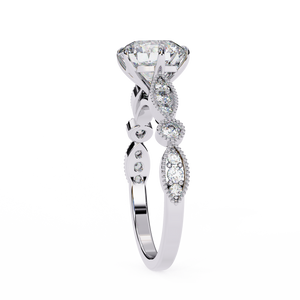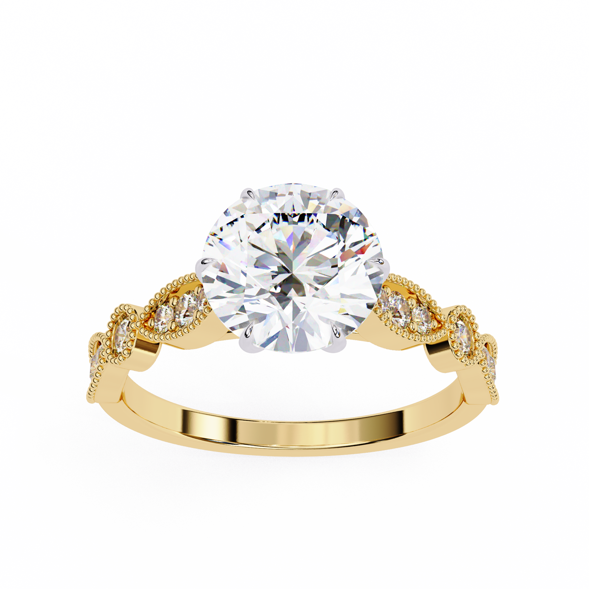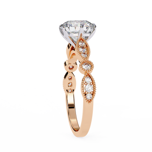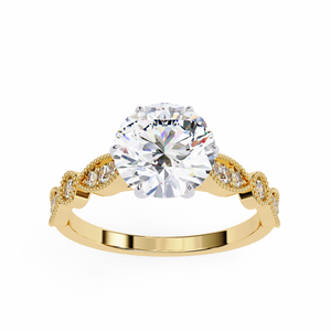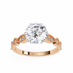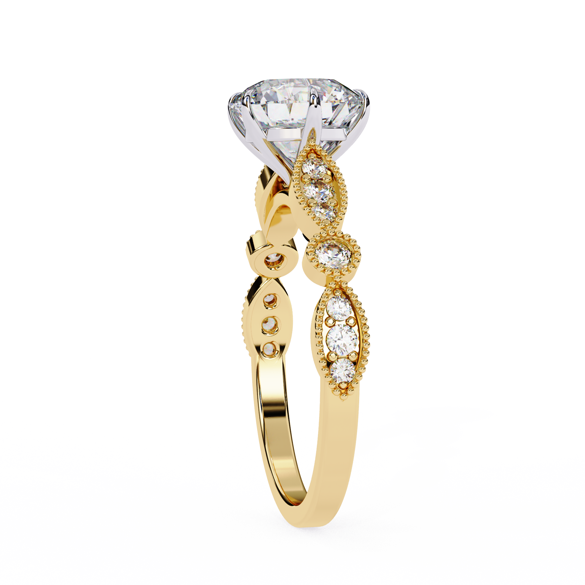 This elegant 14K diamond engagement ring features a dazzling round-cut center stone complemented by a beautifully detailed milgrain band with marquise-shaped accents. Each side diamond adds depth and sparkle, enhancing the ring’s vintage-inspired charm. Crafted for those who adore timeless beauty, this ring combines classic artistry with modern brilliance a perfect expression of everlasting love.