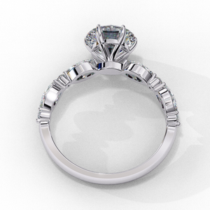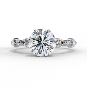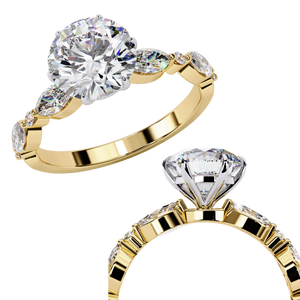 This luxurious 14K engagement ring showcases a captivating round brilliant center diamond, flanked by marquise and round side stones in a sleek alternating pattern. The marquise accents add graceful elongation, while the round stones enhance brilliance from every angle. Crafted with a polished gold band and a secure prong setting, this ring perfectly balances modern refinement and timeless sparkle — making it an ideal choice for the contemporary bride.