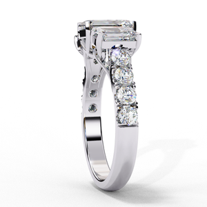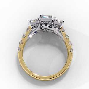 This exquisite 14K two-tone engagement ring combines classic charm with modern craftsmanship. It features a brilliant trio of emerald-cut diamonds symbolizing the past, present, and future of your love. The white gold setting accentuates the diamonds’ clarity and brilliance, while the contrasting gold band adds warmth and depth. The side stones and band are adorned with perfectly matched round accent diamonds, creating a radiant symphony of sparkle. A stunning choice for those who value timeless beauty with a contemporary twist.