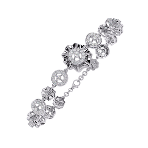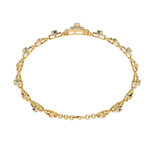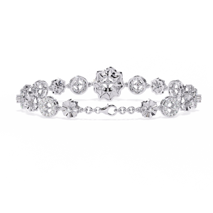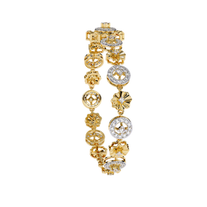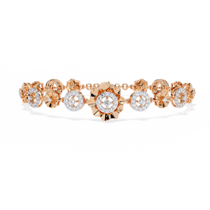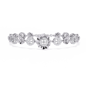 This exquisite 14K bracelet showcases a contemporary open design adorned with five round diamonds at the center. A fine diamond-studded band gracefully aligns beside it, adding a layer of sophistication and brilliance. The modern structure offers both luxury and minimalism, making it an elegant statement piece for any occasion.