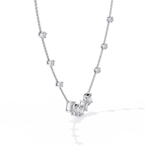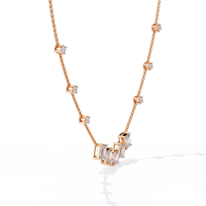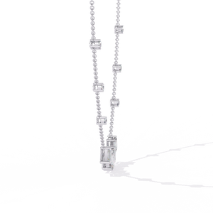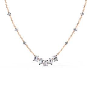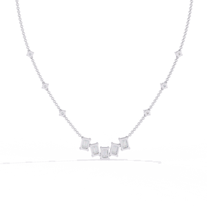 This 14K baguette diamond graduating necklace features a stunning arrangement of step-cut baguette diamonds complemented by round accents along the chain. The graceful graduation design exudes modern sophistication and timeless elegance, ideal for special occasions or daily luxury wear.