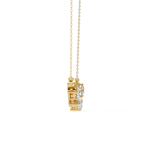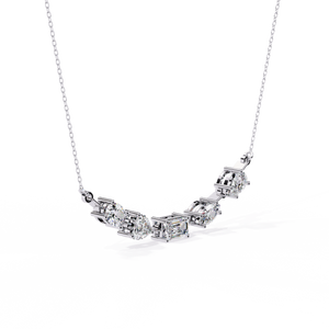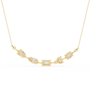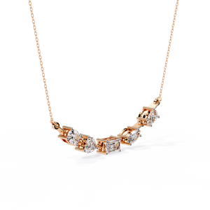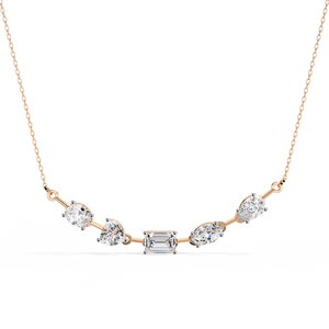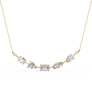 A captivating 14K gold necklace featuring a stunning combination of diamond shapes emerald, oval, and pear gracefully arranged in a graduating sequence. Each diamond catches light from every angle, creating a radiant sparkle that enhances both modern and classic styles.