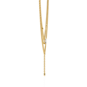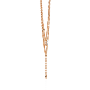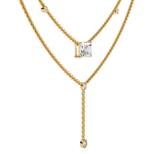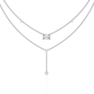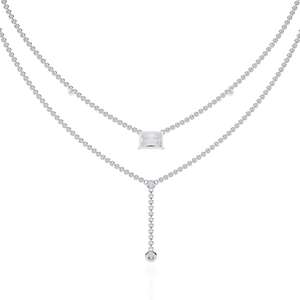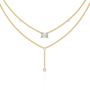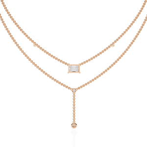 This 14K radiant diamond layered necklace features a stunning rectangular diamond centerpiece complemented by a delicate drop chain accent. Its elegant double-layer design and shimmering diamonds make it perfect for both day and evening sophistication.