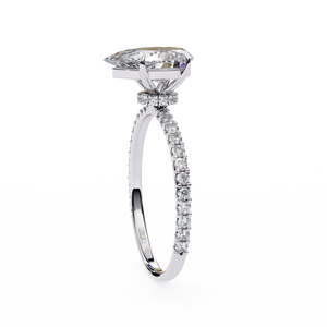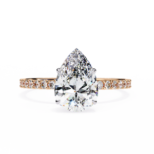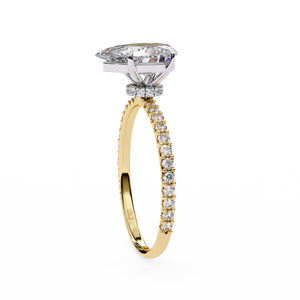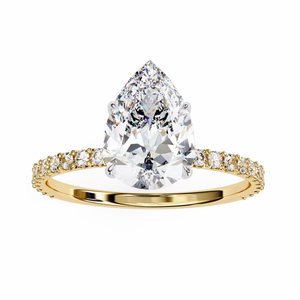 This dazzling 14K yellow gold ring showcases a brilliant pear-shaped lab-grown diamond, complemented by a half eternity band of sparkling round diamonds. The design combines modern elegance with timeless charm, symbolizing everlasting love and beauty. Perfect for engagements, anniversaries, or meaningful milestones.