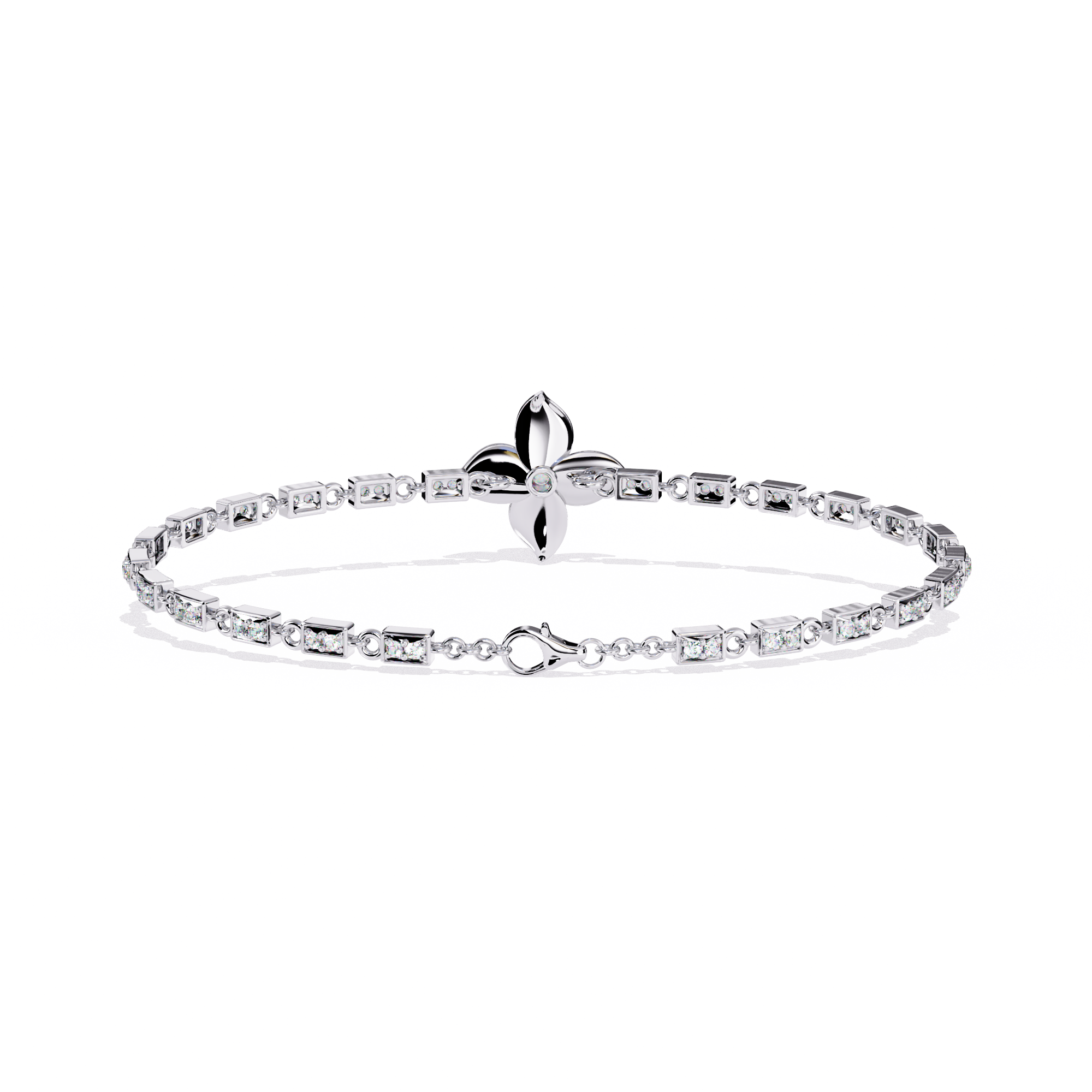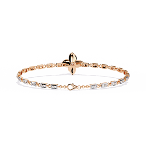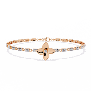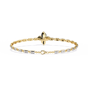 This 14K gold bracelet showcases a radiant floral centerpiece complemented by a sleek row of bezel-set diamonds. The blend of geometric links and a soft flower motif adds a balance of strength and grace, making it an elegant choice for both casual and formal wear.