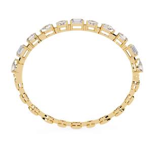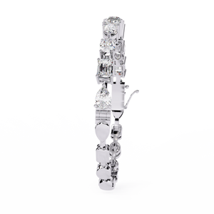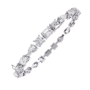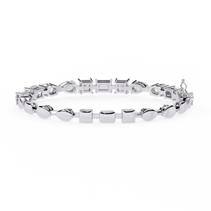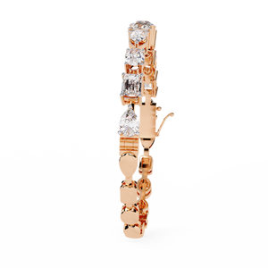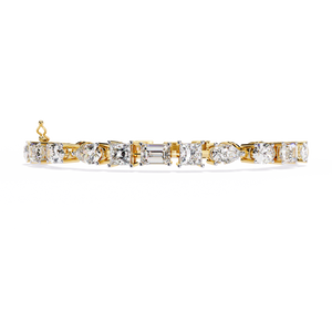 This 14K gold tennis bracelet showcases an artistic blend of diamond shapes pear, oval, princess, and emerald for a dynamic and luxurious look. Each stone is perfectly aligned to create a seamless flow of sparkle, reflecting both creativity and classic elegance. A refined choice for those who appreciate statement-making sophistication.
