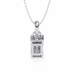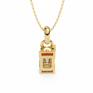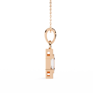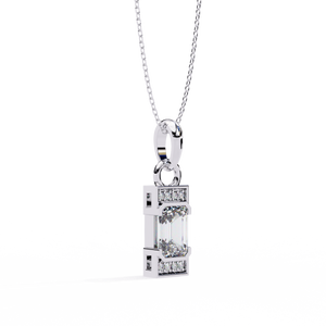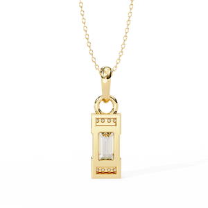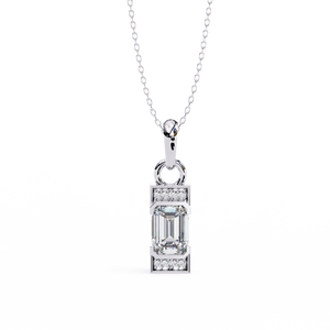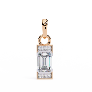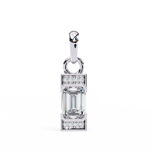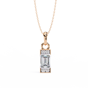 A refined 14K pendant featuring a step-cut emerald diamond framed by sleek geometric edges and pavé-set accents. Its minimalist design with Art Deco charm creates an elegant yet bold statement for modern sophistication.