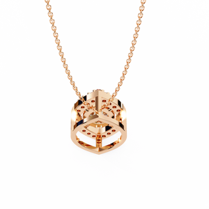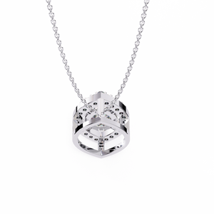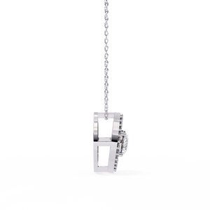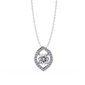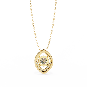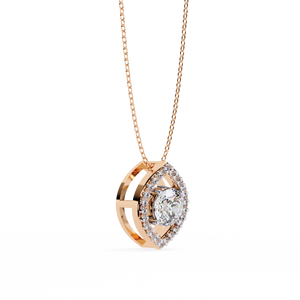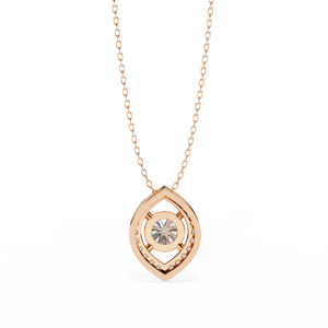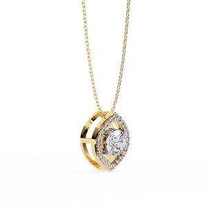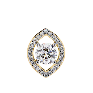 This 14K pendant showcases a brilliant round diamond framed in a marquise-shaped halo. The elegant pointed silhouette and pavé diamonds create a radiant sparkle, blending classic design with modern sophistication.