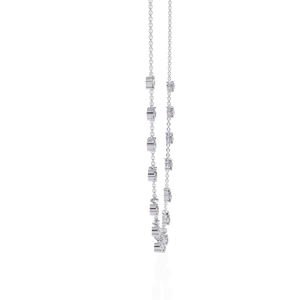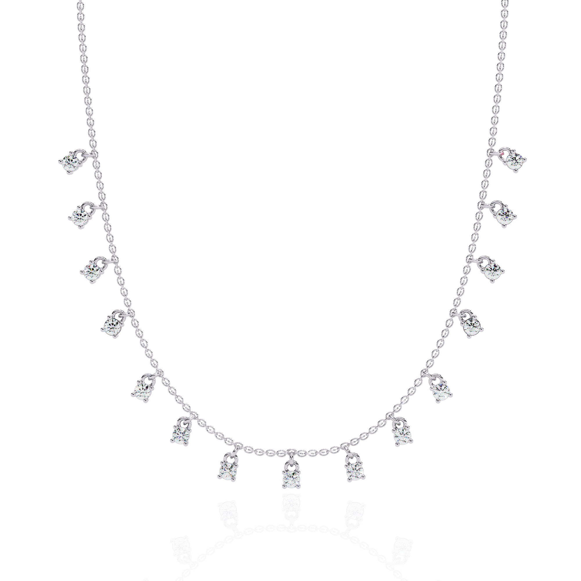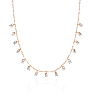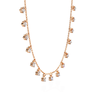 Crafted in 14K gold, this elegant necklace showcases a series of delicate diamond drops that glimmer with every movement. The refined hanging design adds playful sophistication, making it a perfect choice for both everyday wear and evening elegance.