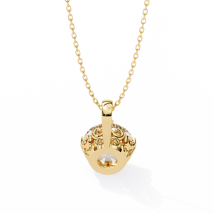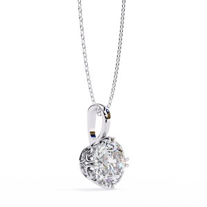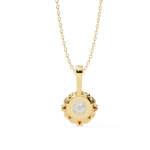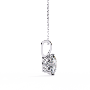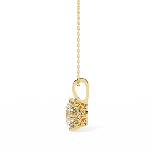 Crafted in 14K gold, this solitaire pendant showcases a round brilliant diamond held by six prongs, enhanced with elegant filigree detailing along the sides. Ideal for timeless sophistication.