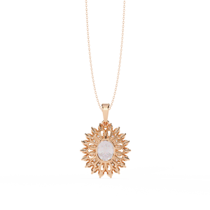 This radiant 14K pendant features a stunning round diamond encircled by a halo of shimmering stones in a sunburst design. Symbolizing light and energy, it brings brilliance and timeless elegance to any look.