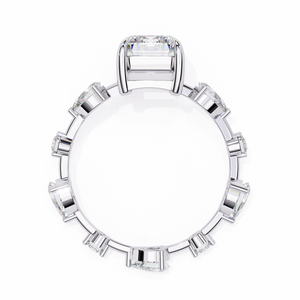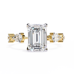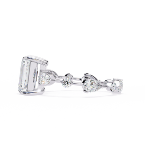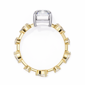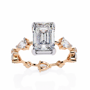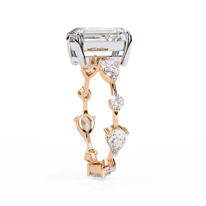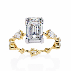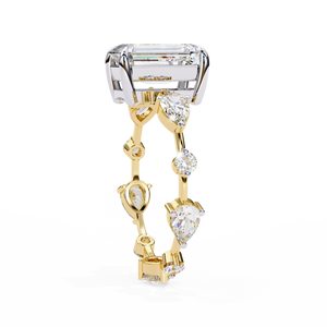 This 14K engagement ring showcases a striking emerald-cut diamond at its center, beautifully paired with an eternity-inspired band. The band features alternating pear, round, and bezel-set diamonds that create a luxurious and continuous sparkle. Designed with precision and elegance, this piece perfectly combines modern geometry with timeless grace ideal for proposals or as a signature heirloom ring.