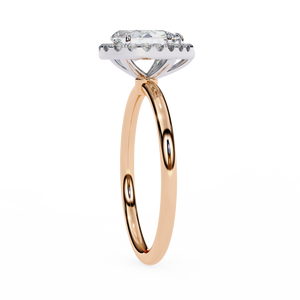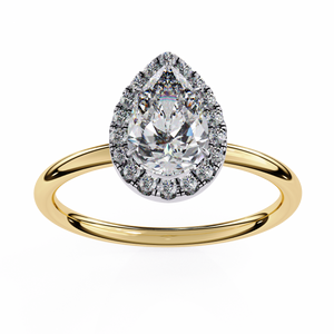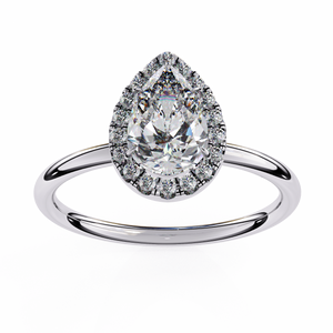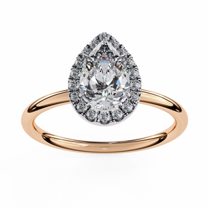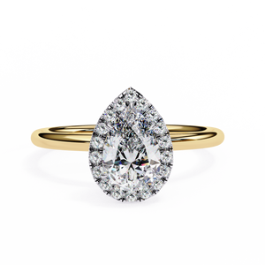 This stunning 14K engagement ring features a brilliant pear-shaped lab-grown diamond surrounded by a halo of smaller accent stones. The pear shape creates a unique and elegant look, while the halo design enhances the diamond’s sparkle and brilliance. A perfect symbol of love, handcrafted with precision and grace.