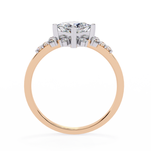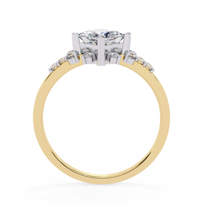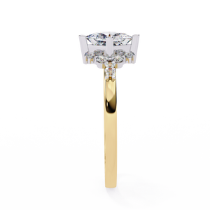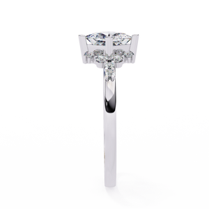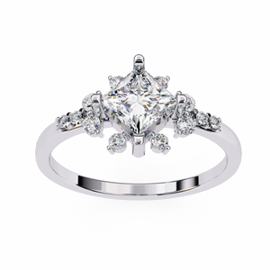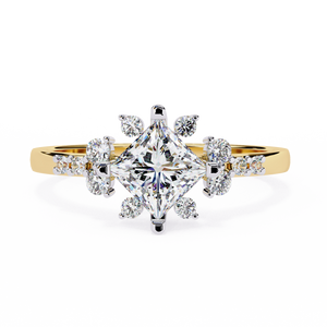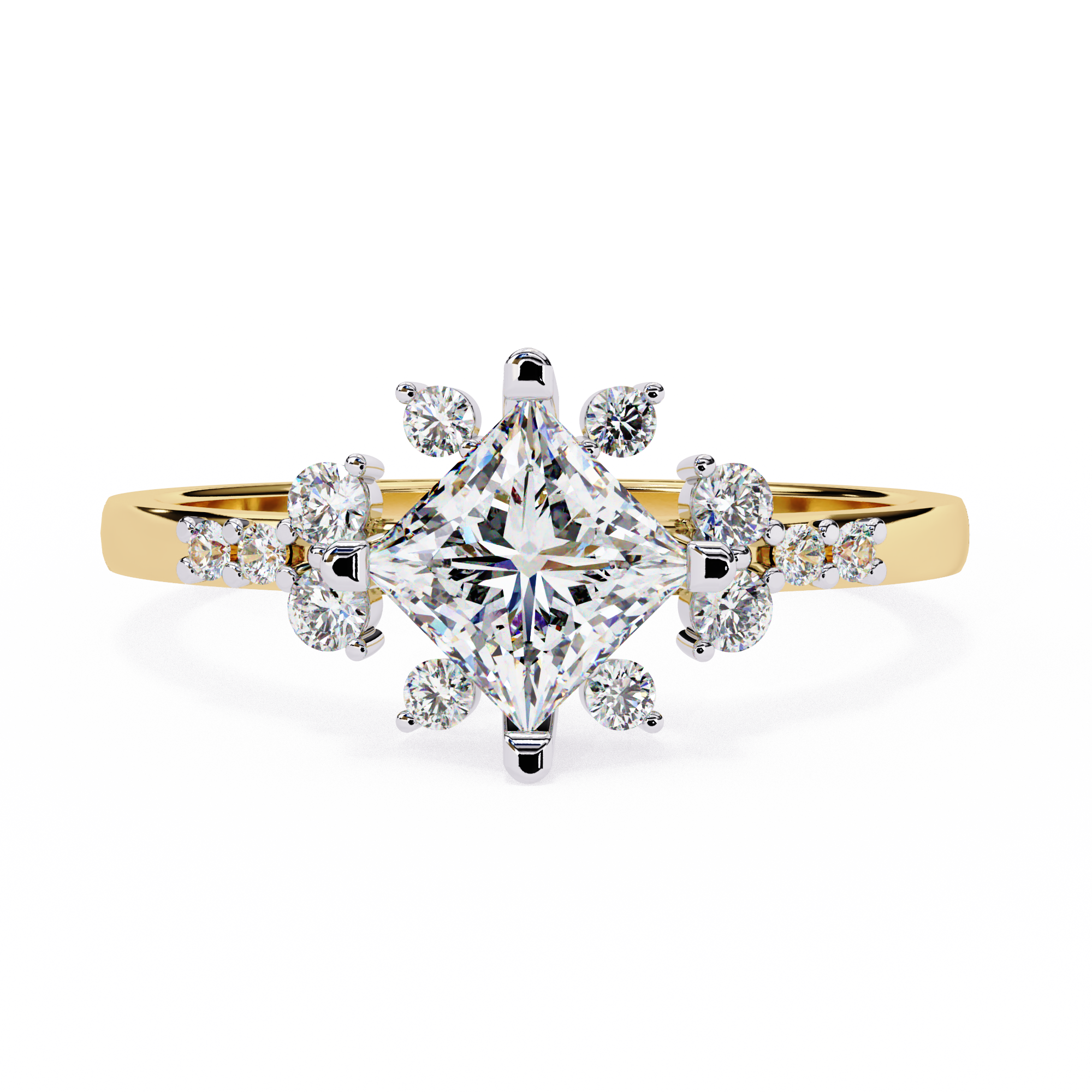 This captivating 14K engagement ring features a brilliant princess-cut center diamond surrounded by a cluster of round accent stones for added sparkle. The intricate side detailing enhances its radiance, making it a perfect blend of modern sophistication and timeless romance.