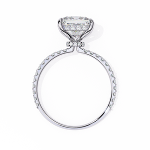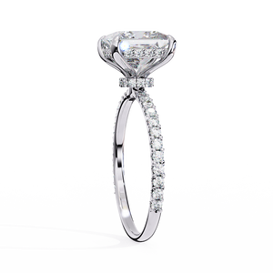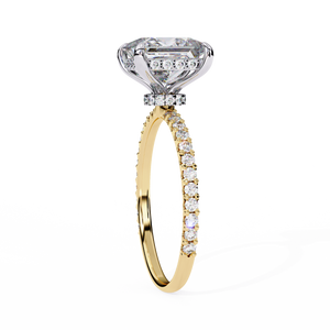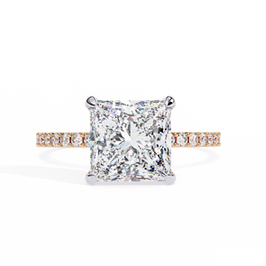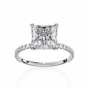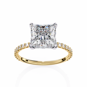 This exquisite 14K engagement ring showcases a radiant princess-shaped lab-grown diamond set on a sleek diamond-accented band. The elegant prong setting elevates the center stone for maximum brilliance and sparkle, making it a timeless piece for your most special moment.