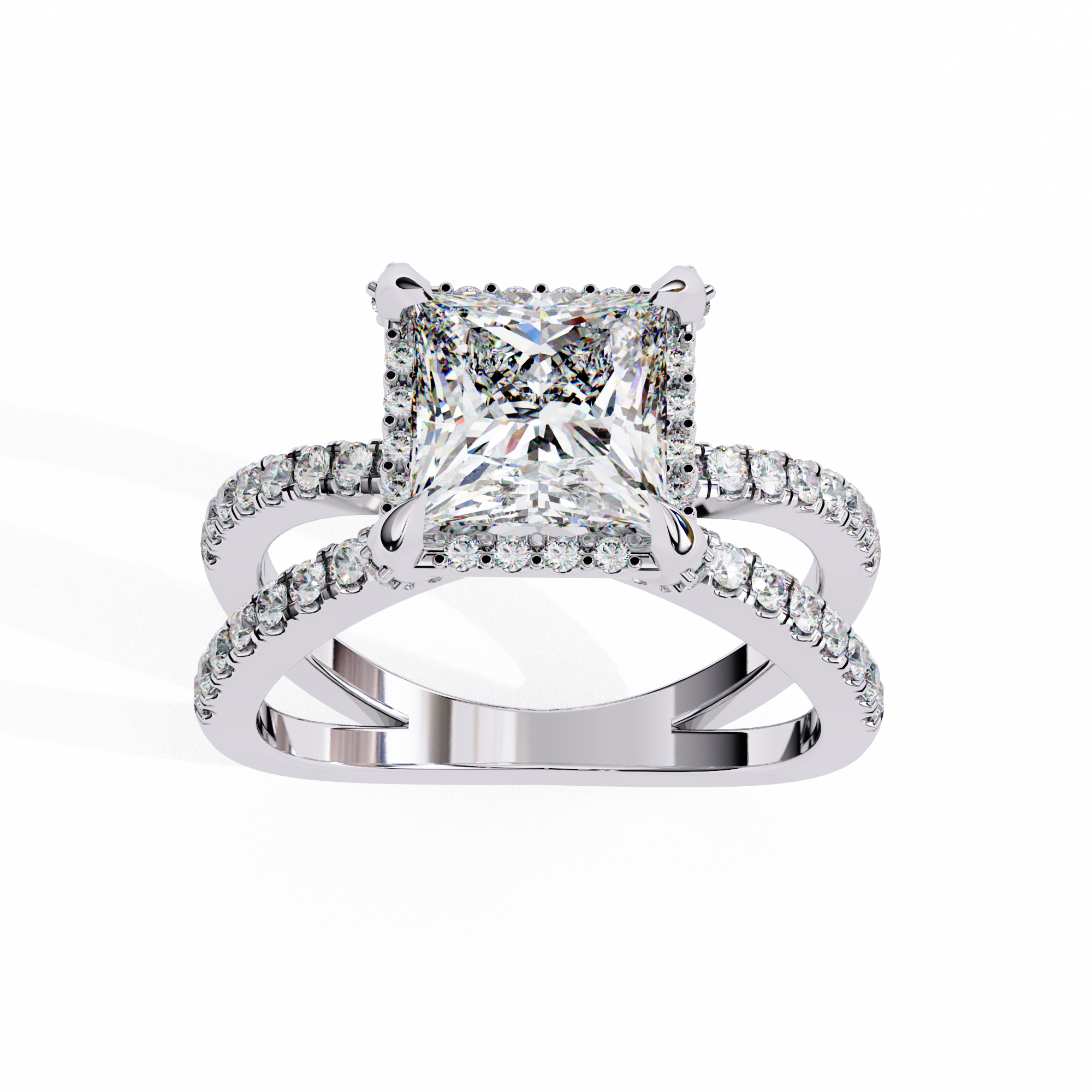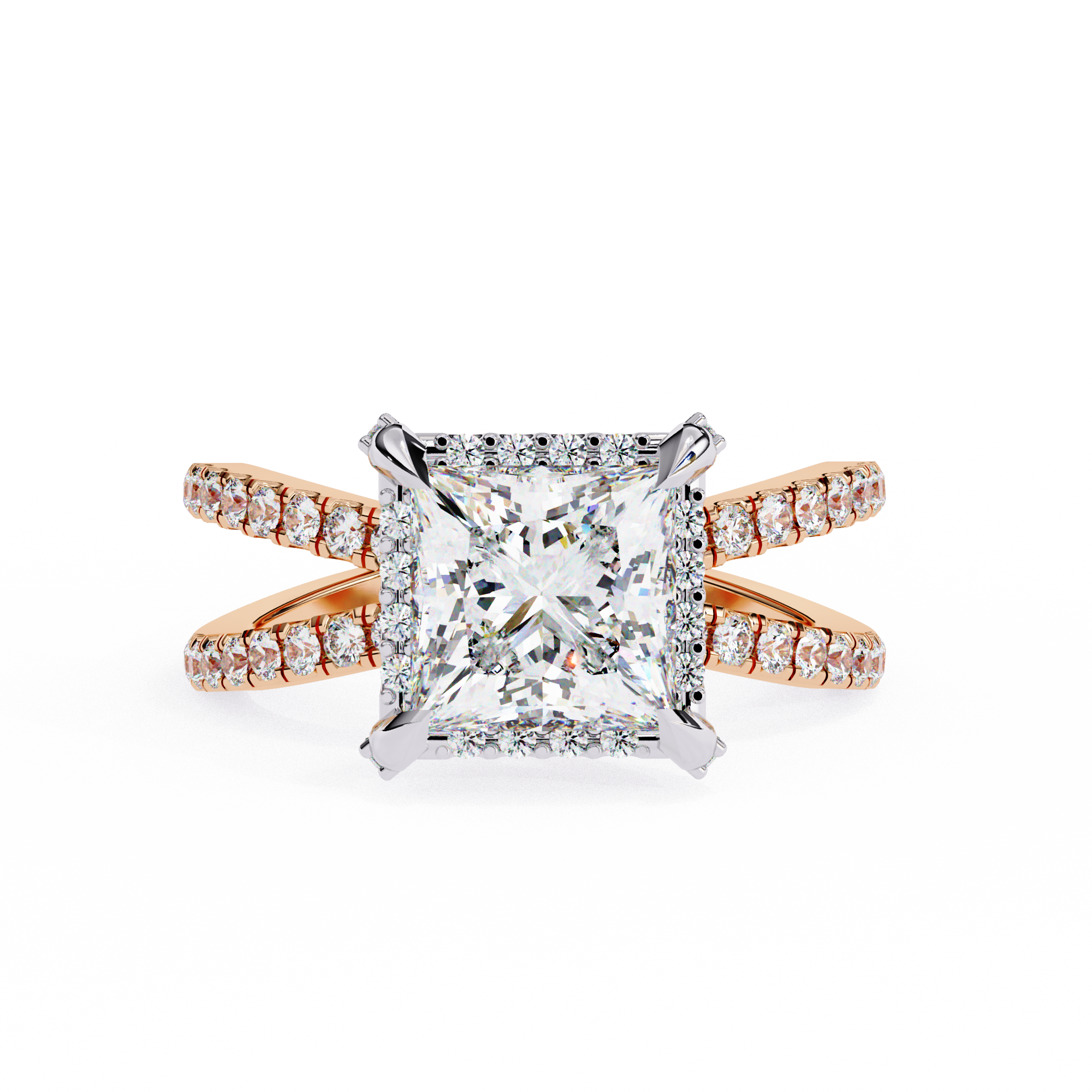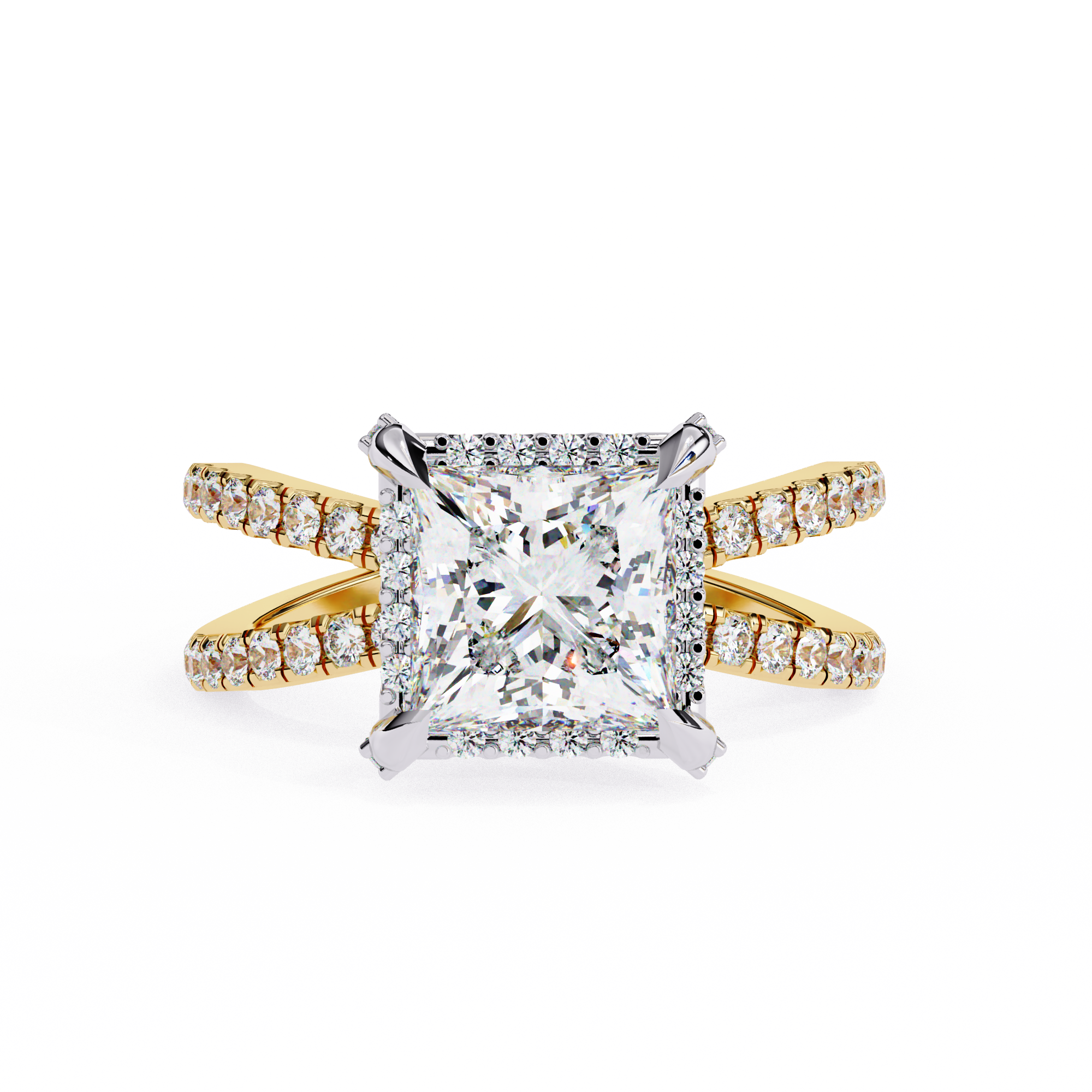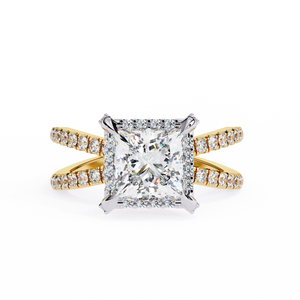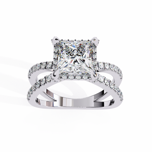 This elegant 14K diamond engagement ring features a radiant princess-cut center stone framed by a glittering halo for extra brilliance. The split shank band is adorned with pavé-set round diamonds, enhancing the ring’s sparkle and adding depth to its design. Crafted to perfection, this ring blends timeless luxury with modern sophistication — an unforgettable symbol of everlasting love.