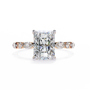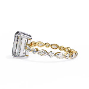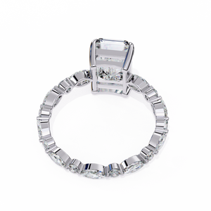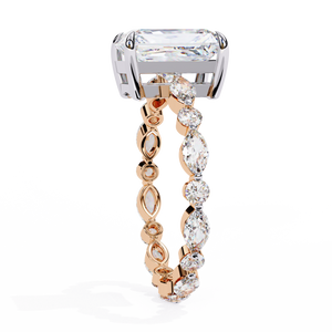 This 14K engagement ring highlights a breathtaking radiant-cut diamond set atop an eternity-style band. The shank features alternating marquise, round, and bezel-set diamonds arranged in a continuous pattern for maximum brilliance and sophistication. A perfect balance of modern geometry and timeless romance, this ring is designed to symbolize everlasting love and unmatched elegance.