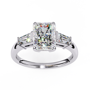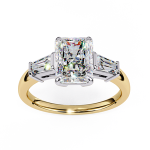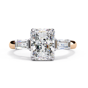 A modern interpretation of timeless elegance, this 14K engagement ring showcases a radiant-cut center diamond flanked by two tapered baguette side stones. The sleek geometric lines of the baguettes perfectly complement the fiery brilliance of the radiant center, creating a design that’s both bold and balanced. Crafted in a two-tone finish white gold for the setting and rose gold for the band this ring exudes sophistication and luxury. Ideal for those who appreciate clean design and contemporary glamour.
