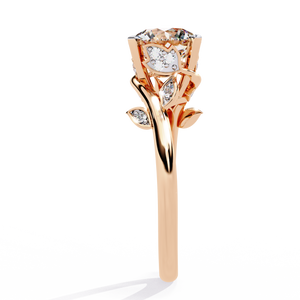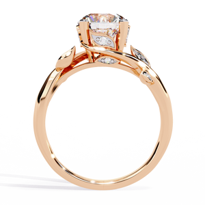 This 14K engagement ring blends nature-inspired beauty with modern craftsmanship. A brilliant round diamond sits elegantly at the center, accented by delicate leaf-shaped details and sparkling side stones. Its graceful design symbolizes growth, love, and new beginnings perfect for brides who adore timeless elegance with an organic touch.