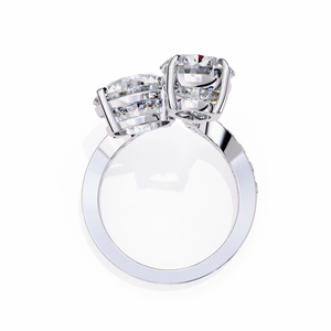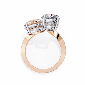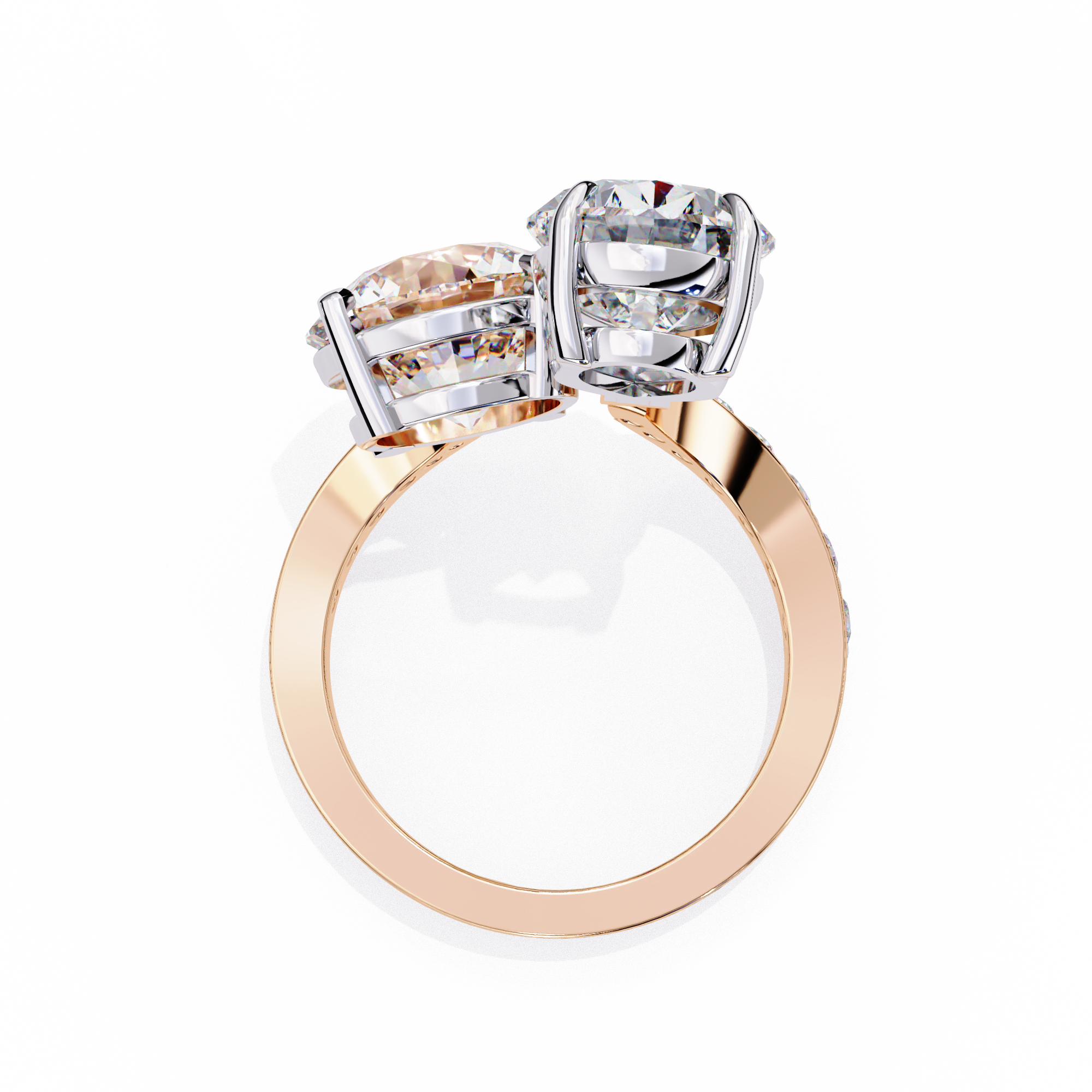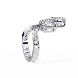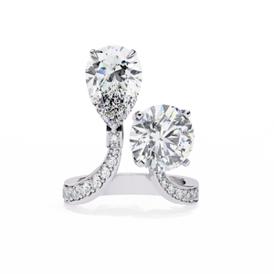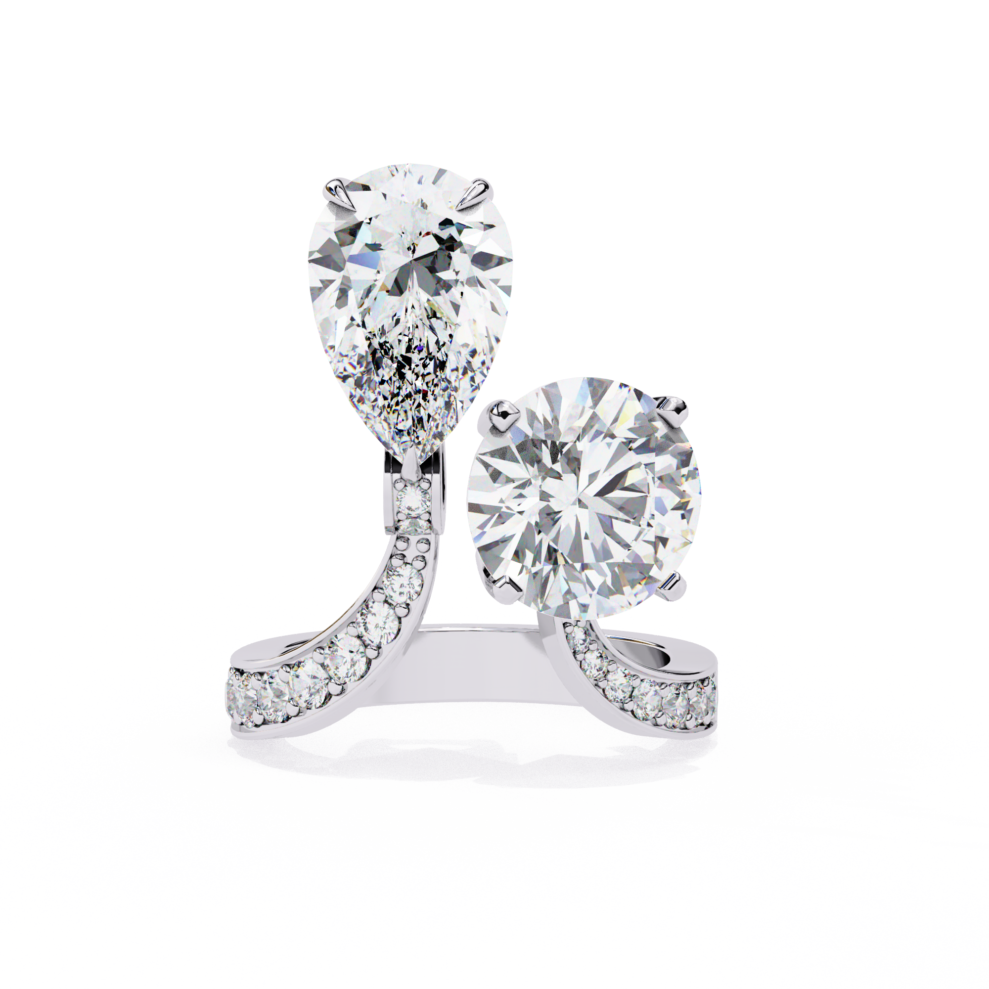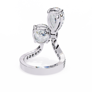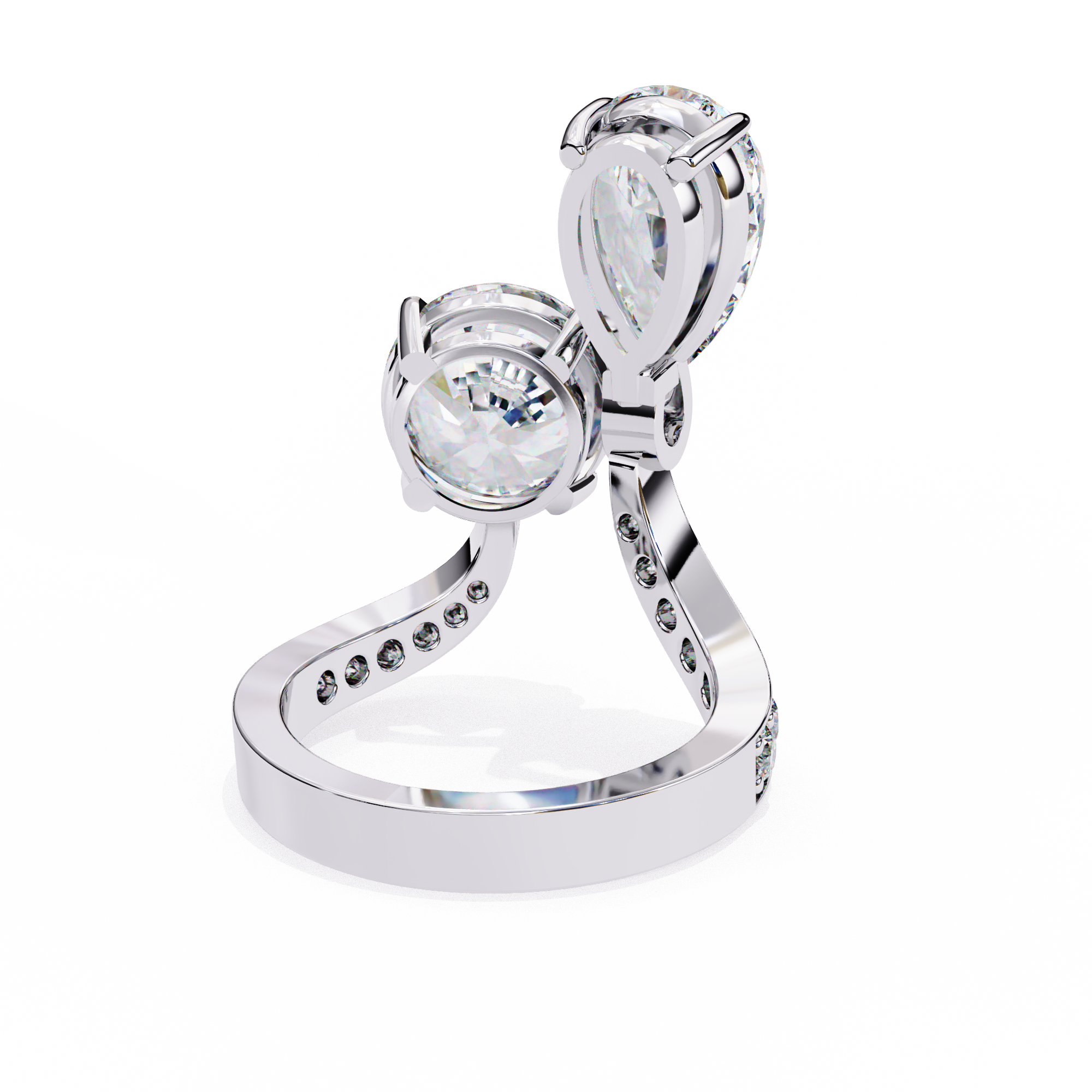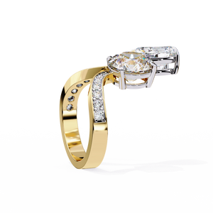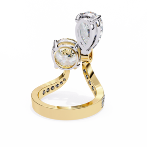 This 14K engagement ring features a stunning Toi Et Moi design with two dazzling center diamonds a pear-cut and a round-cut symbolizing two souls united in love. The curved band is elegantly lined with brilliant pavé-set diamonds for extra sparkle and sophistication. A perfect blend of romance and artistry, this piece redefines modern luxury and timeless elegance.