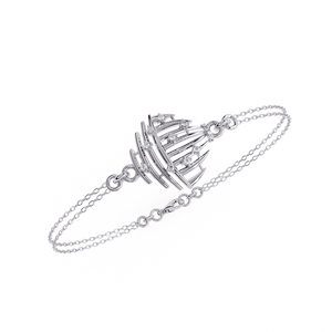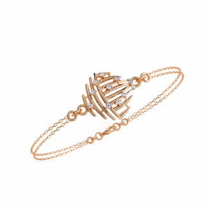 A modern bracelet featuring an artistic dome-shaped centerpiece accented with sparkling diamonds. The layered metal design and delicate dual-chain give it a sculptural and contemporary appeal.