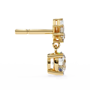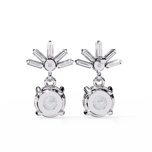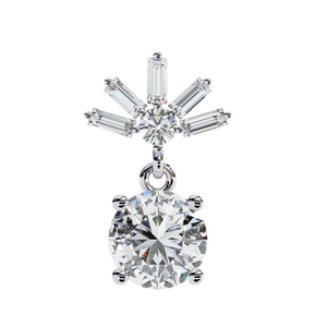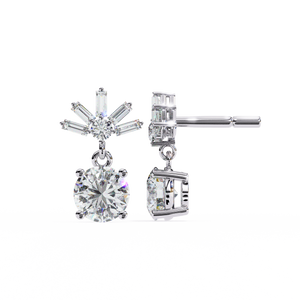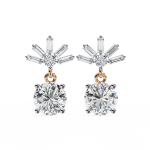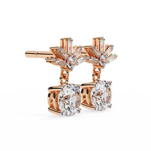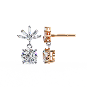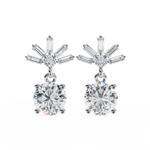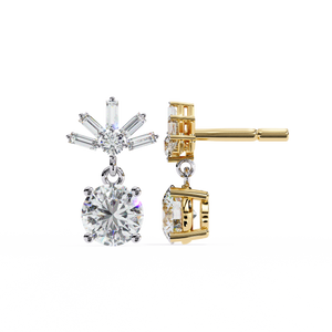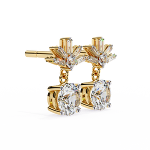 These 14K gold Diamond Drop Earrings feature a brilliant round diamond suspended below a radiant burst of baguette and round stones in an elegant 4-prong design. Their graceful motion and luminous sparkle make them perfect for elevating evening looks or special occasions.