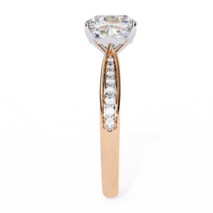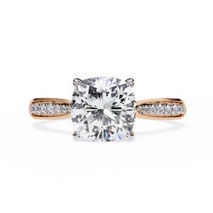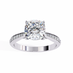 This exquisite 14K engagement ring features a stunning cushion-shaped lab-grown diamond, beautifully elevated on a delicate pavé-set band. The elegant split-shank design with a hidden halo adds sparkle from every angle, symbolizing grace and everlasting love.