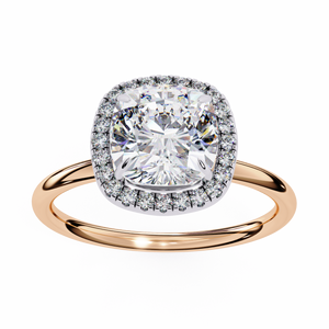 This radiant 14K ring showcases a breathtaking cushion-shaped lab-grown diamond encircled by a shimmering halo of smaller diamonds. The elegant halo design enhances the brilliance and presence of the center stone, creating a captivating sparkle from every angle. A timeless piece, perfect for engagements and cherished occasions.
