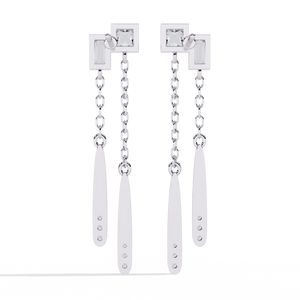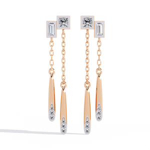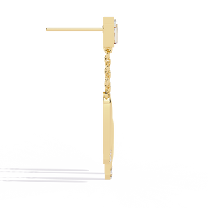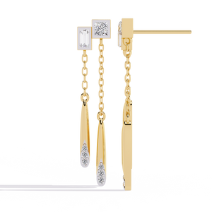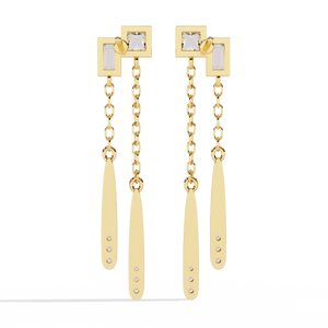 Elevate your modern style with these 14K gold geometric chain drop earrings. Featuring sleek diamond-accented shapes and elegant dangling bars, they exude contemporary charm with every movement. Perfect for evening wear or bold daytime elegance, these earrings redefine sophistication.
