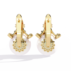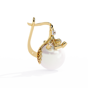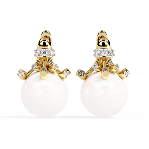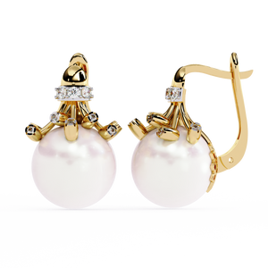 These 14K gold Pearl Lever Backs Earrings showcase a luminous pearl crowned with sparkling diamonds in an artistic, sculpted setting. The elegant blend of pearls and diamonds adds refined grace and brilliance perfect for formal occasions or sophisticated everyday wear.