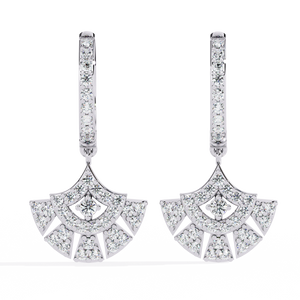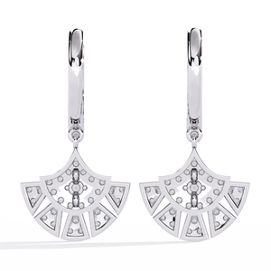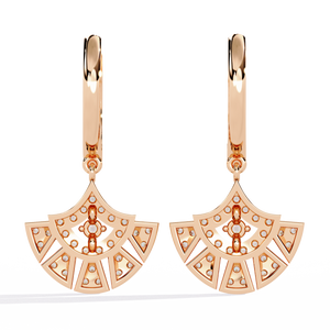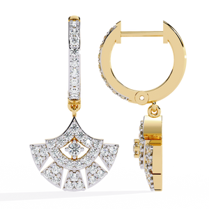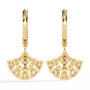Make a statement with these exquisite 14K gold fan motif drops earrings. Designed with sparkling diamonds arranged in elegant geometric layers, they exude refined glamour. Perfect for special occasions or daily sophistication, these earrings capture light and attention effortlessly.
