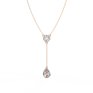 This elegant 14K gold pendant features two bezel-set diamonds a round and a pear shape gracefully linked in a vertical drop. Minimal yet luxurious, it’s perfect for layering or adding subtle sophistication to any outfit.