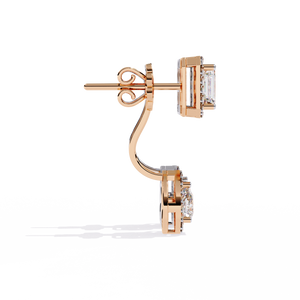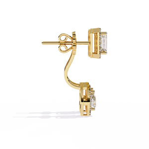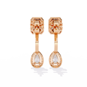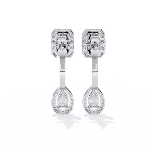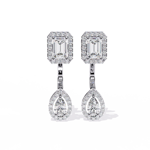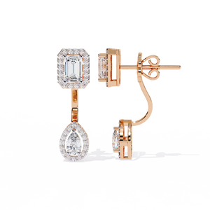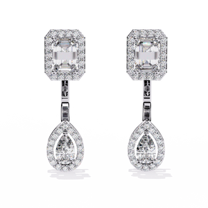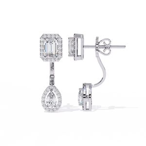 A stunning balance of geometry and elegance, these 14K gold drop earrings feature an emerald-cut diamond top with a pear-shaped diamond drop, both framed in shimmering halos. The secure setting highlights the brilliance of each stone, creating a timeless statement of luxury.