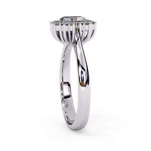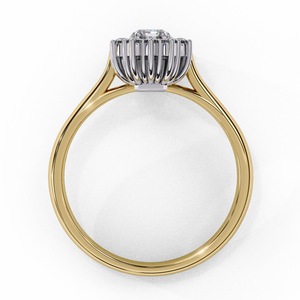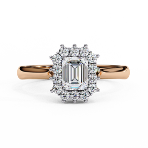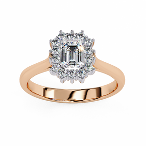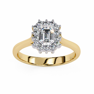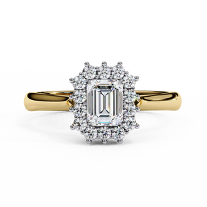 A true masterpiece of elegance, this 14K Emerald Halo Engagement Ring showcases a stunning emerald-cut center diamond encircled by a halo of round brilliant stones. The crisp facets of the emerald cut exude sophistication, while the surrounding halo adds dimension and radiance from every angle. The ring’s two-tone design a white gold basket atop a luminous yellow gold band delivers both contrast and harmony, making it a perfect choice for modern yet timeless appeal.