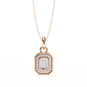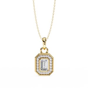 This 14K gold pendant features a striking emerald-cut diamond at the center, surrounded by a halo of brilliant round diamonds. Its bold geometric shape and refined sparkle make it a perfect blend of elegance and modern luxury.