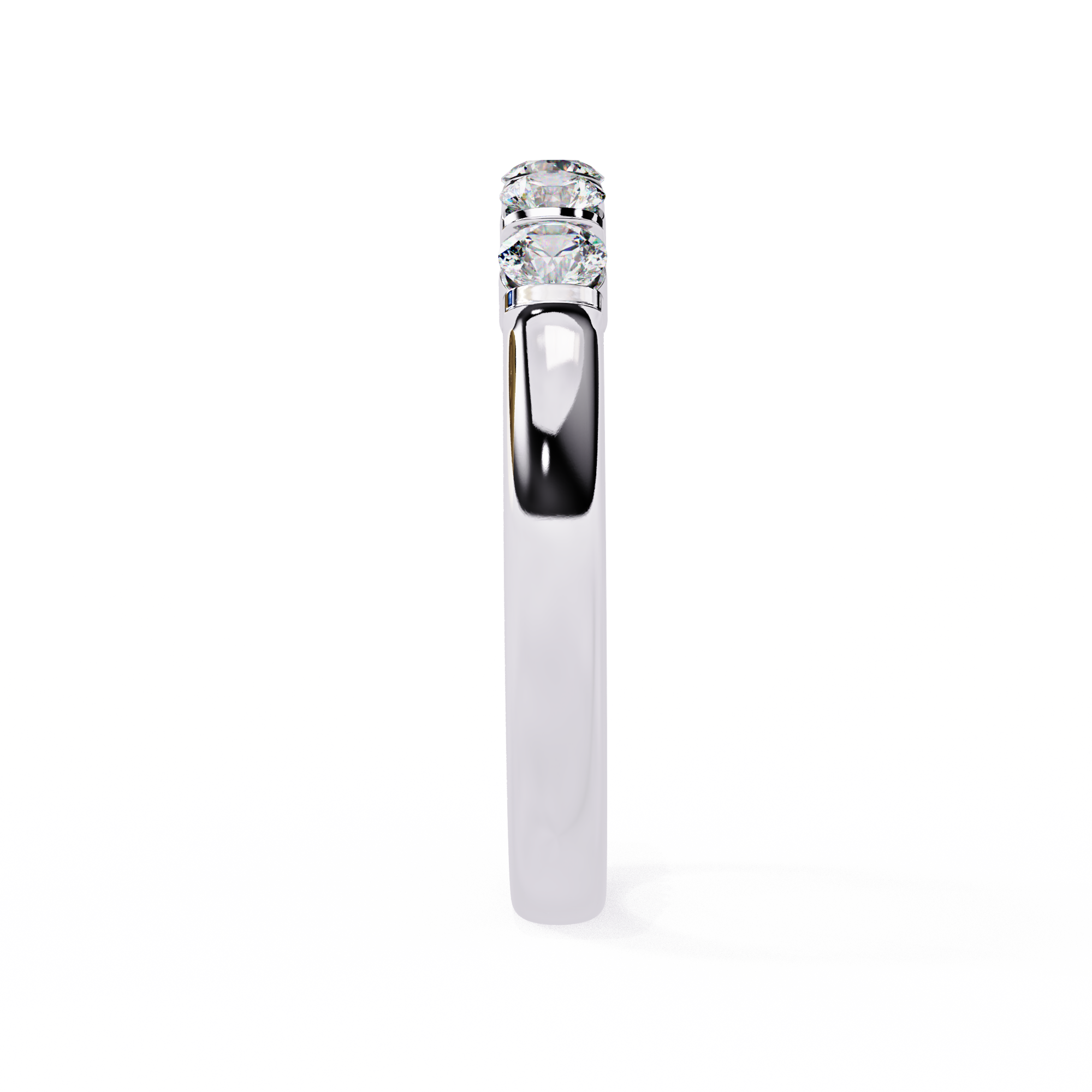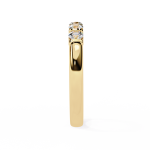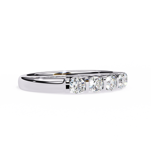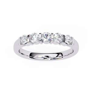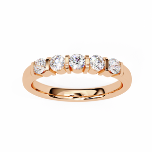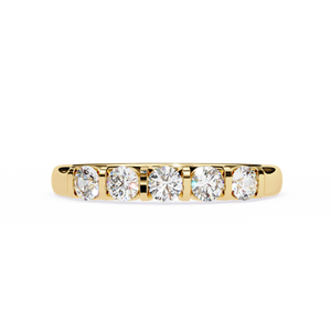 Classic yet timeless, this 14K five-stone diamond band features a perfect lineup of round brilliant cut diamonds set securely in a sleek channel-style setting. Each diamond is meticulously placed to create a continuous sparkle across the band, symbolizing enduring love and togetherness. Ideal as a wedding band, anniversary ring, or stacking piece, this design blends refined craftsmanship with understated luxury.