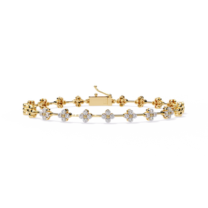 A graceful 14K gold bracelet adorned with diamond-studded floral motifs, creating a delicate yet radiant look. Each flower is intricately crafted to add a feminine charm, making it perfect for both daily wear and special occasions.