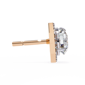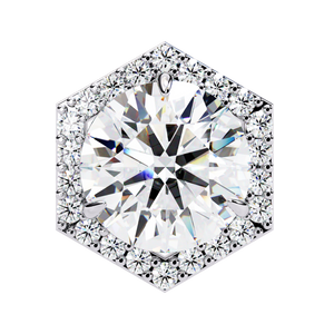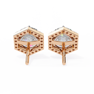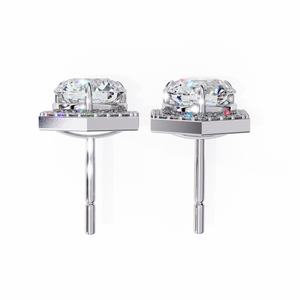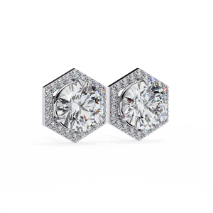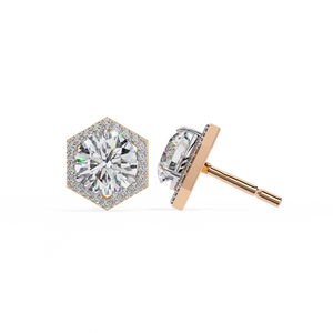 These 14K gold Diamond Stud Earrings feature a dazzling round diamond framed by a hexagon-shaped halo of fine pavé stones in a secure 3-prong setting. A bold geometric twist on a timeless classic, they radiate luxury and modern sophistication from every angle.