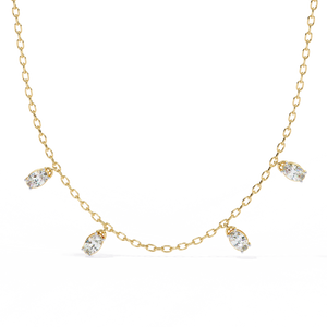 This 14K marquise diamond fashion necklace features five delicately dangling marquise diamonds on a fine gold chain. Its minimalist yet elegant design adds subtle sparkle, making it the perfect everyday statement piece.