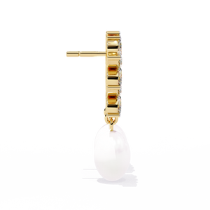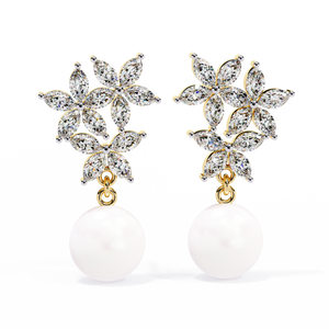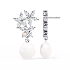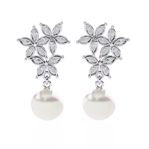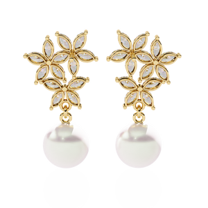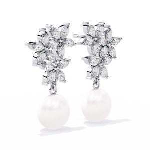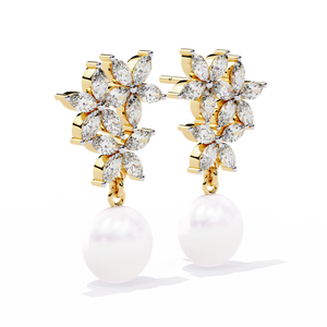 These 14K gold Diamond and Pearl Drop Earrings feature a stunning floral motif crafted from marquise diamonds, gracefully paired with luminous pearls. The intricate prong floral setting adds brilliance, while the pearls bring a timeless, sophisticated elegance to any ensemble.