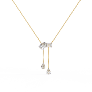 A striking 14K gold pendant with a modern geometric twist, featuring pear and emerald-cut diamonds in a cascading drop design. Its fluid movement and radiant sparkle make it an elegant statement for any occasion.