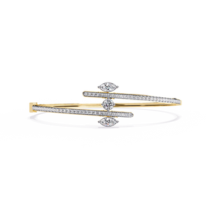 A sleek open bangle design featuring two marquise-cut diamonds complemented by a central round diamond. Its modern linear form and delicate brilliance create an elegant statement piece ideal for both everyday wear and special occasions.